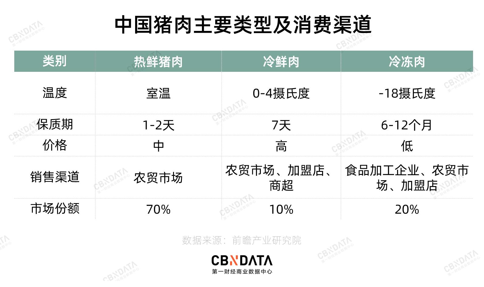 不同于国外肉类消费以冷鲜肉为主,中国人70%的猪肉消费都是“热鲜肉”(现宰未冰冻的猪肉,常温运输出售,保质期1-2天)。在中国人的固有认知中,冻过的肉不如现宰的新鲜好吃。由于热鲜肉存在地理辐射半径的限制,单个产地的猪肉往往专供周边地区。