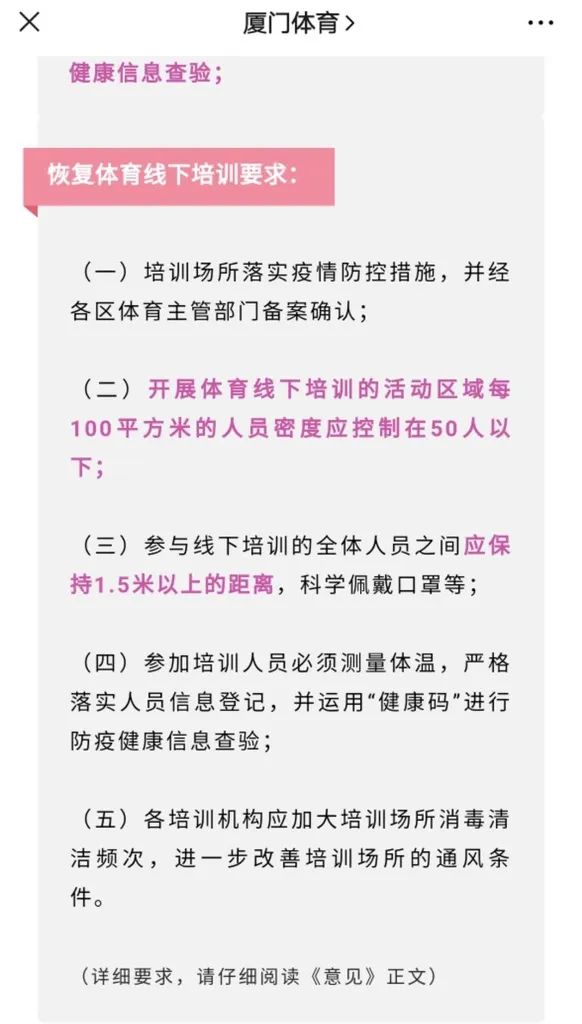 5月10日,厦门市发布公告,提及“体育赛事、业余训练活动和各类社会培训机构,可有序恢复举办或营业”,这也是疫情以来最早宣布恢复社会培训尤其是包含体育类机构营业的城市之一。