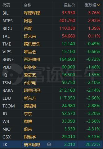 跌幅较大的有:瑞幸咖啡跌28.72%,蛋壳公寓跌14.47%,500彩票网跌12.47%,品钛跌10.92%,虎牙跌10.76%,瑞思学科跌9.59%,新氧跌8.77%,乐信跌6.75%,朴新教育跌6.67%,简普科技跌6.56%。