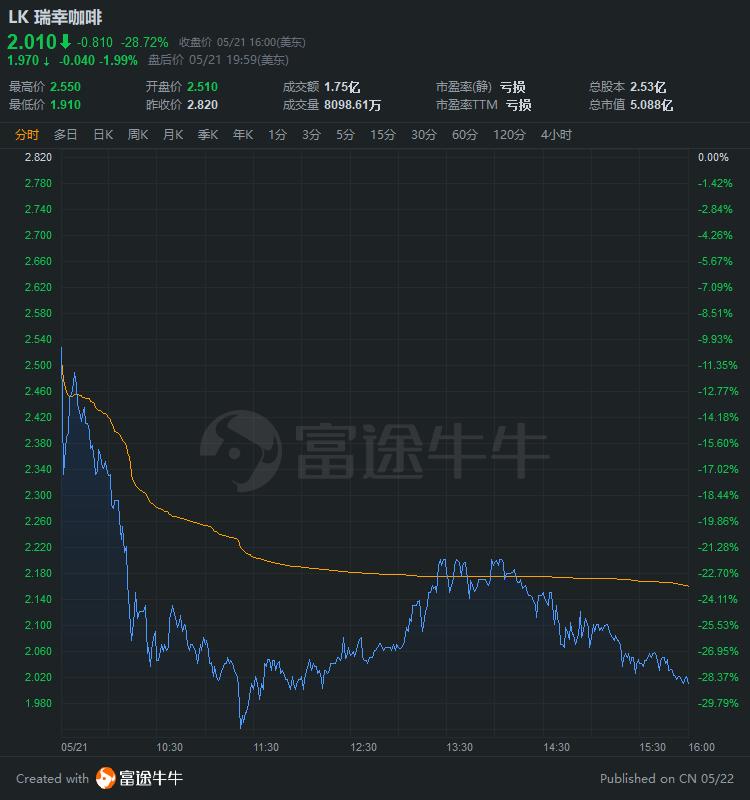 复牌第二日,瑞幸咖啡股价再度大跌。截至收盘,公司股价跌至2.01美元,跌幅28.72%。
