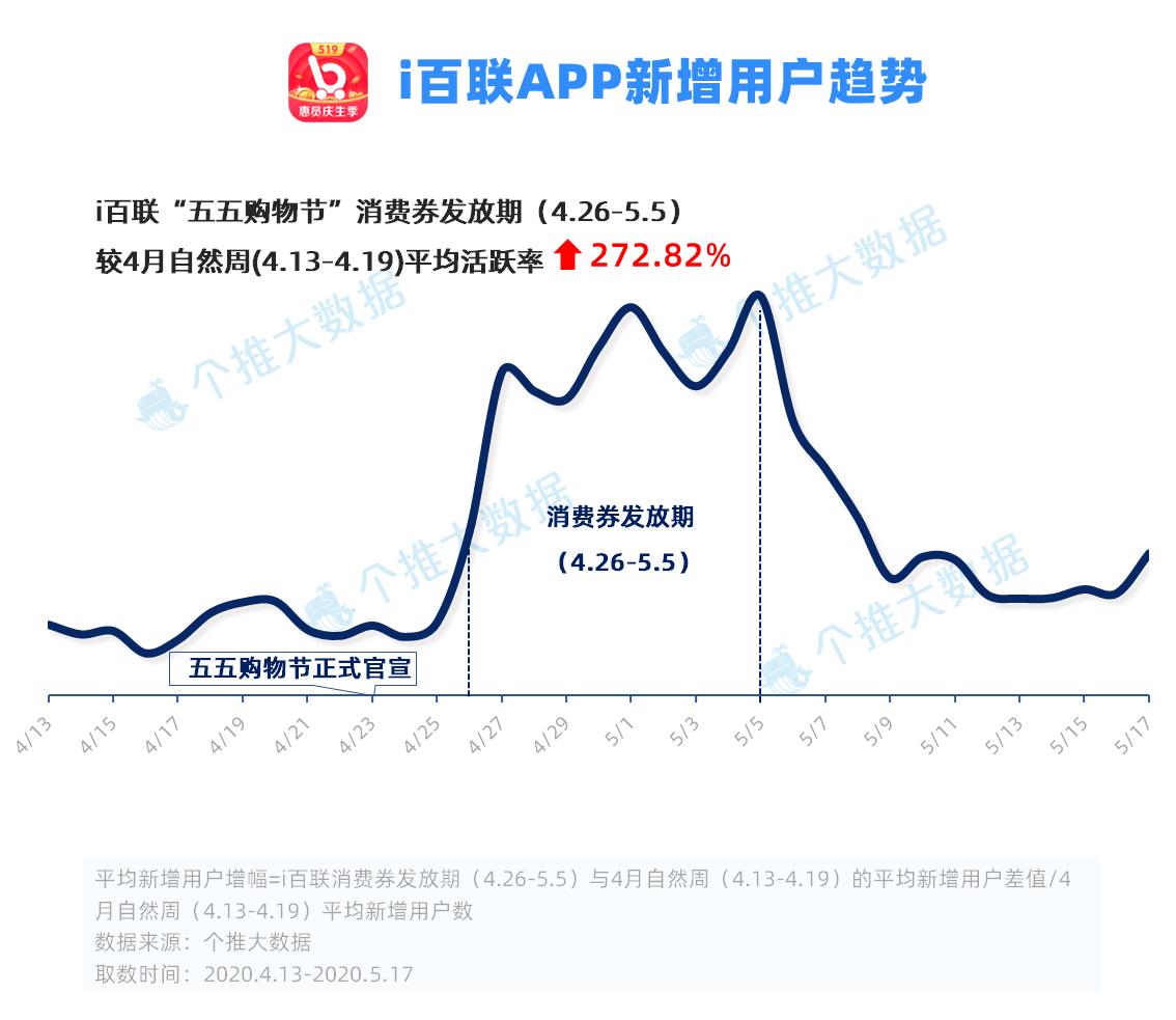 此外,每日互动个推大数据重点关注了上海知名的百联集团旗下购物生活服务APP“ i百联”的用户新增情况。作为“五五购物节”的重要参与者,百联集团于4月26日至5月5日期间在i百联平台和线下门店发放12亿消费券,迅速点燃了消费者的购物热情。数据显示,自4月25日起,i 百联的新增用户数有了较为明显的增长,并且在消费券发放期间(4.26-5.5)保持在一个较高水平。从新增用户增幅来看,i百联在消费券发放期的平均新增用户相较4月自然周增长了272.82%。随着i百联四周年等活动的进行,i百联或将触发“五五购物节”新一轮消费高潮。