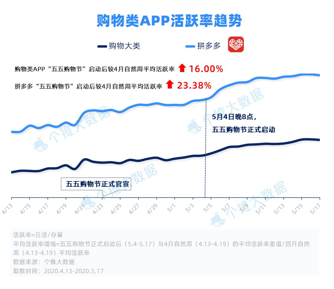 作为落户上海的热门电商购物类APP,拼多多无疑是“五五购物节”最大的受益者。数据显示,拼多多的活跃率高于行业水平,其在五五购物节正式启动后的平均活跃率较“五五购物节”官宣前一周(4.13-4.19)增长了23.38%。“五五购物节”期间,拼多多“百亿补贴”首次进入线下商圈,同时拼多多还与多家上海本地实体商业合作推出了“五五折购车”等活动,有力地带动了线下商圈的人气回升和消费复苏。