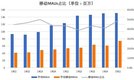 从上图可以图,虎牙付费用户总数创2018年以来历史新高。虎牙付费用户数量的增长主要得益于平台用户的持续增长。根据财报披露,2020年一季度,虎牙直播月均活跃用户数(总MAU)同比增长22.2%达到1.51亿,移动端月均活跃用户数(移动端MAU)同比增长38.6%达到7470万,创历史新高。
