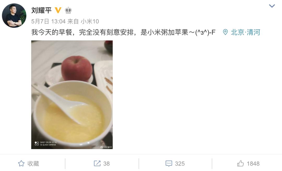 “我今天的早餐,完全没有刻意安排,是小米粥加苹果”。5月7日,刘耀平用小米10手机发了微博,定位显示北京清河,小米科技园所在地。