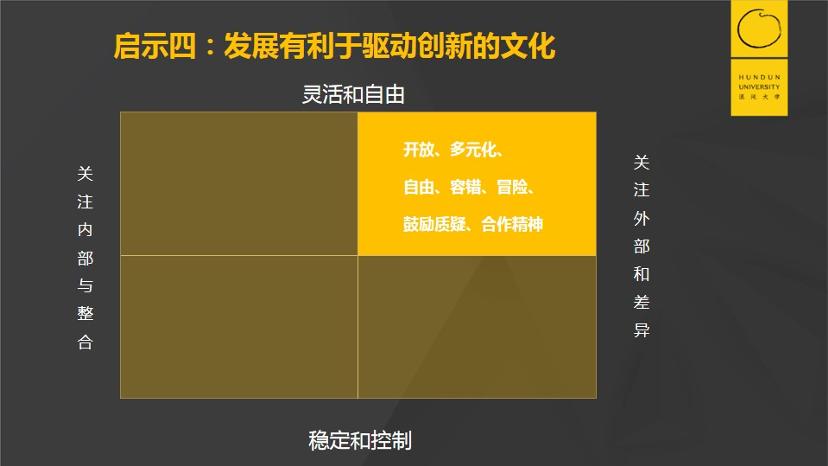 按照谷歌的做法,要想激发创新,这个组织应该建构的文化是偏向于灵活和自由,偏向于外部导向和建构差异化的。