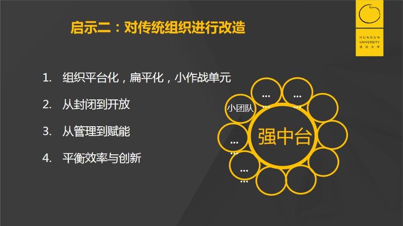今天互联网最典型的组织是强中台,然后有非常多的独立小单元。