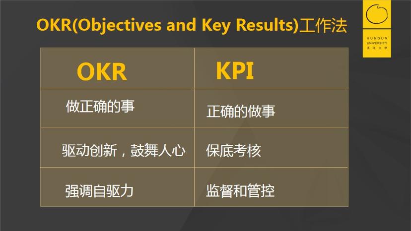 那OKR更多是什么?它强调由下而上,期望大家能够基于目标,去找寻正确的事,激励人心,有自驱力。