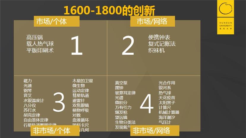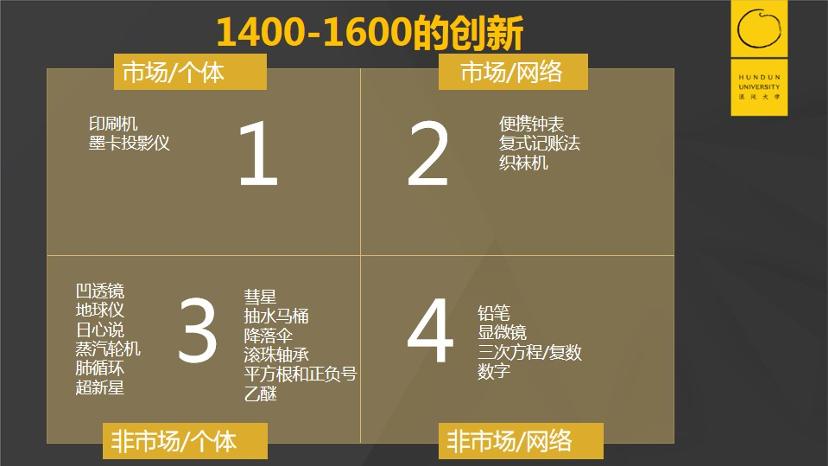 在1400年到1600年这二百年,创新最多的发生在区域3,就是非市场的个体创新。那时候信息不够发达,甚至城市都不是特别发达,所以创新是那些创意大师的专利。