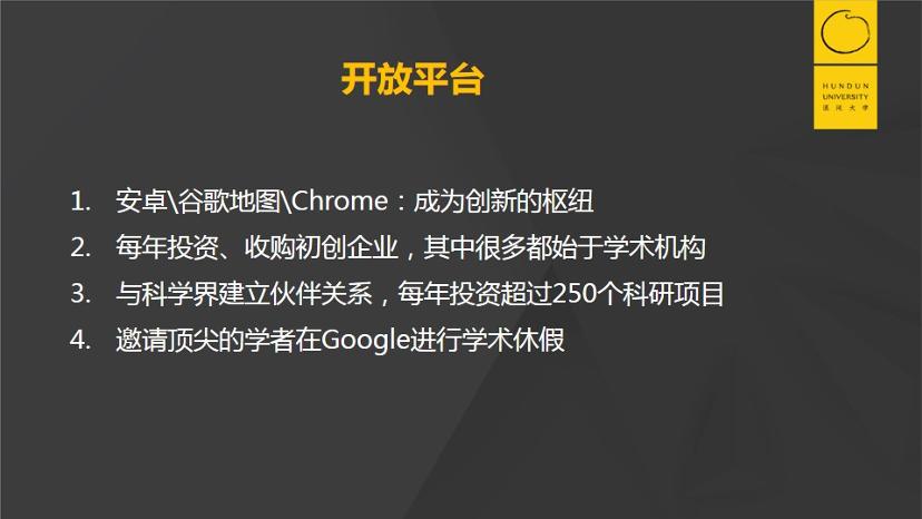 大家会发现谷歌,其实营造的就是一个开放式的生态,这样会连接更多的创新资源。谷歌为这些创新资源赋能,然后这些创新资源回过来又会推动谷歌整个创新生态的发展。