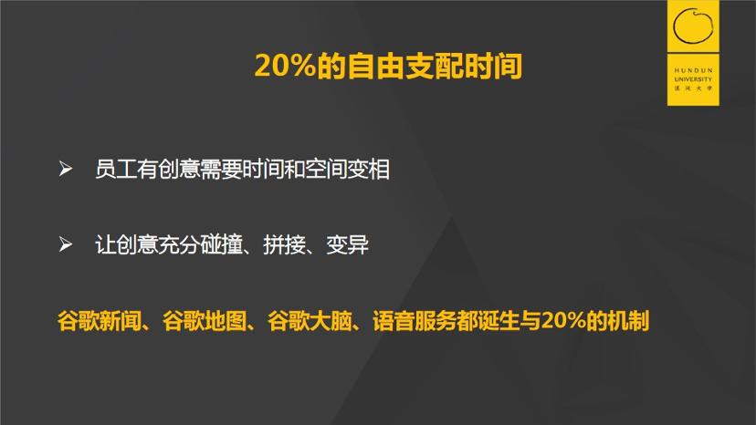 谷歌提供20%的自由时间,希望员工有机会将他脑子里的灵感拿出来与不同人碰撞,产生更多有价值的火花。