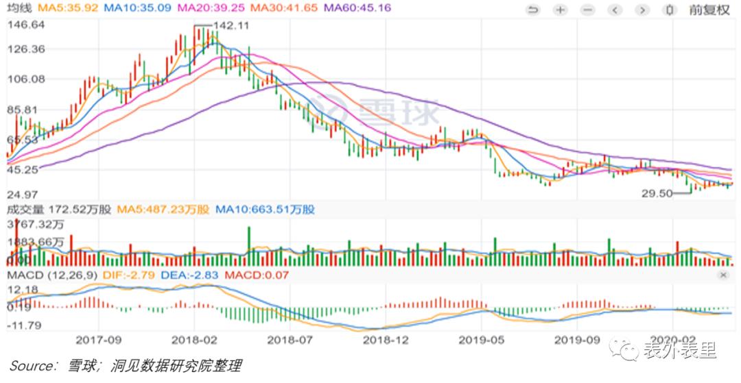 2018年2月后,微博从最高光的142.11跌跌不止,到2019年8月时,已跌至37.08,跌幅达到283%。