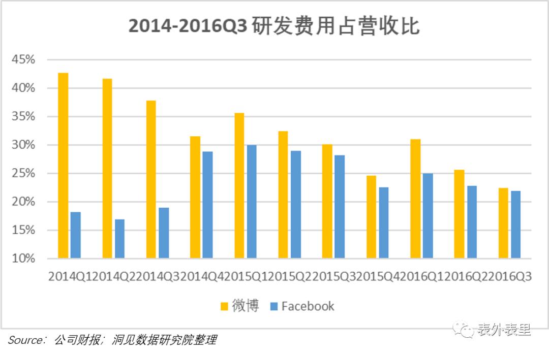于是,微博研发费用占营收比开始下降,此后总是在15%左右徘徊,总是低于Facebook。