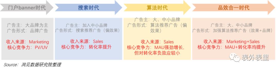 而我们所说四个“小时代”的变迁,总是绕不开Marketing和Sales。不同阶段,平台能为广告主达成的广告效果也有所不同,并且逐渐强化。