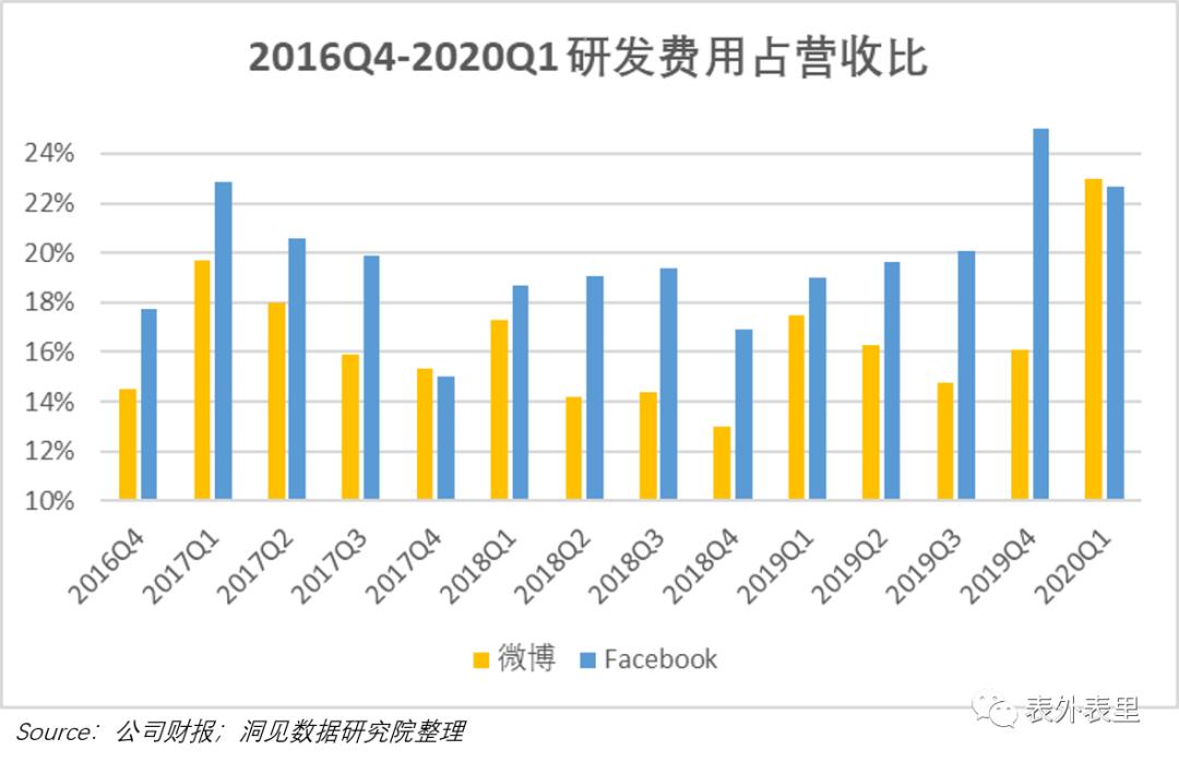 与之相比,由于广告市场竞争愈发激烈,Facebook在研发方面花的钱越来越多,占营收比也越来越高。反观微博,即便在竞争非常激烈的2018和2019年,研发费用占营收比也从未超过18%。