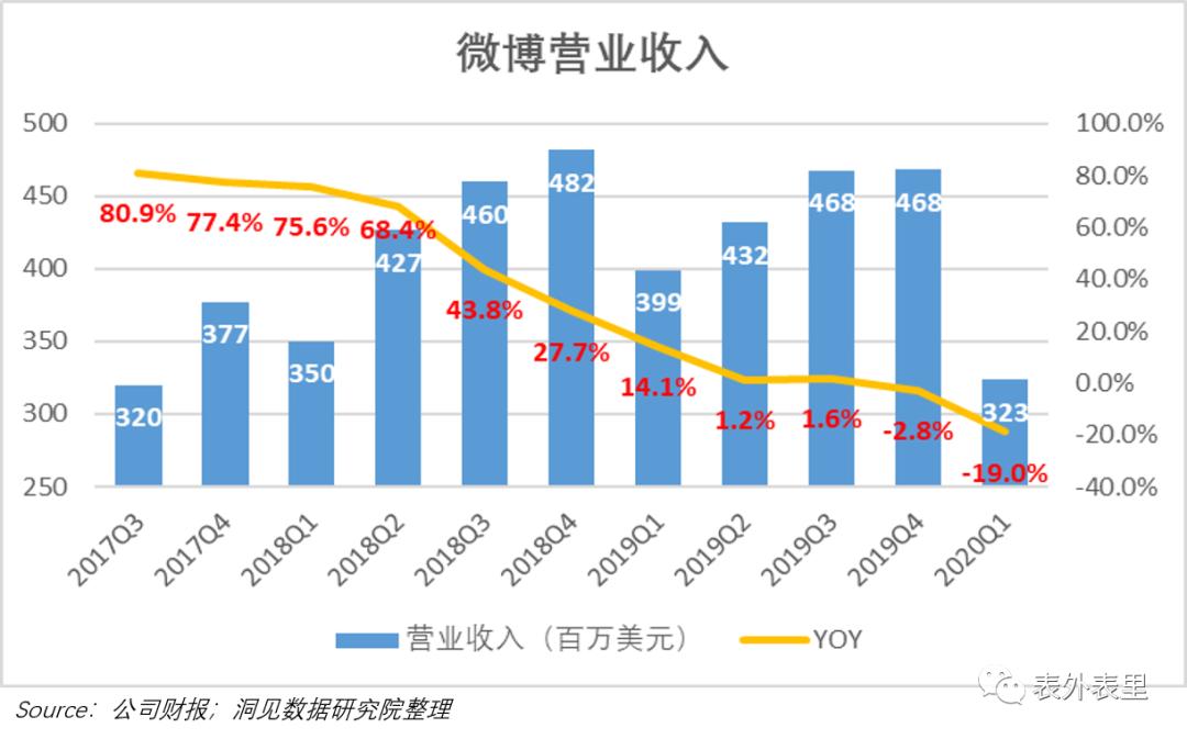投资人预期落空的背后,是微博的持续下滑的收入增速。根据2020Q1财报,微博收入仅3.23亿美元,同比下滑19%,已经是2017Q3以来连续11个季度的同比增速下行。