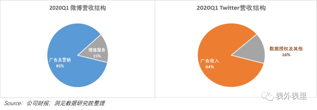先来看微博与Twitter的对比,微博和Twitter一样都更偏向公域社交媒体,核心收入来源也都是广告。2020Q1,两家广告占营收比分别为85.2和84.4。