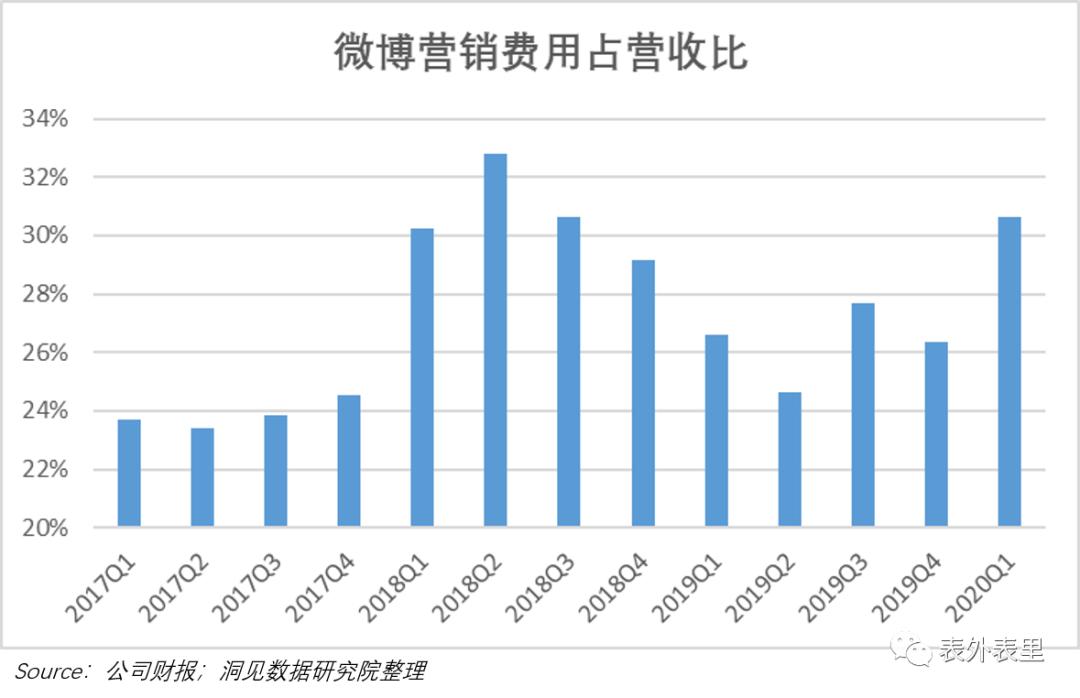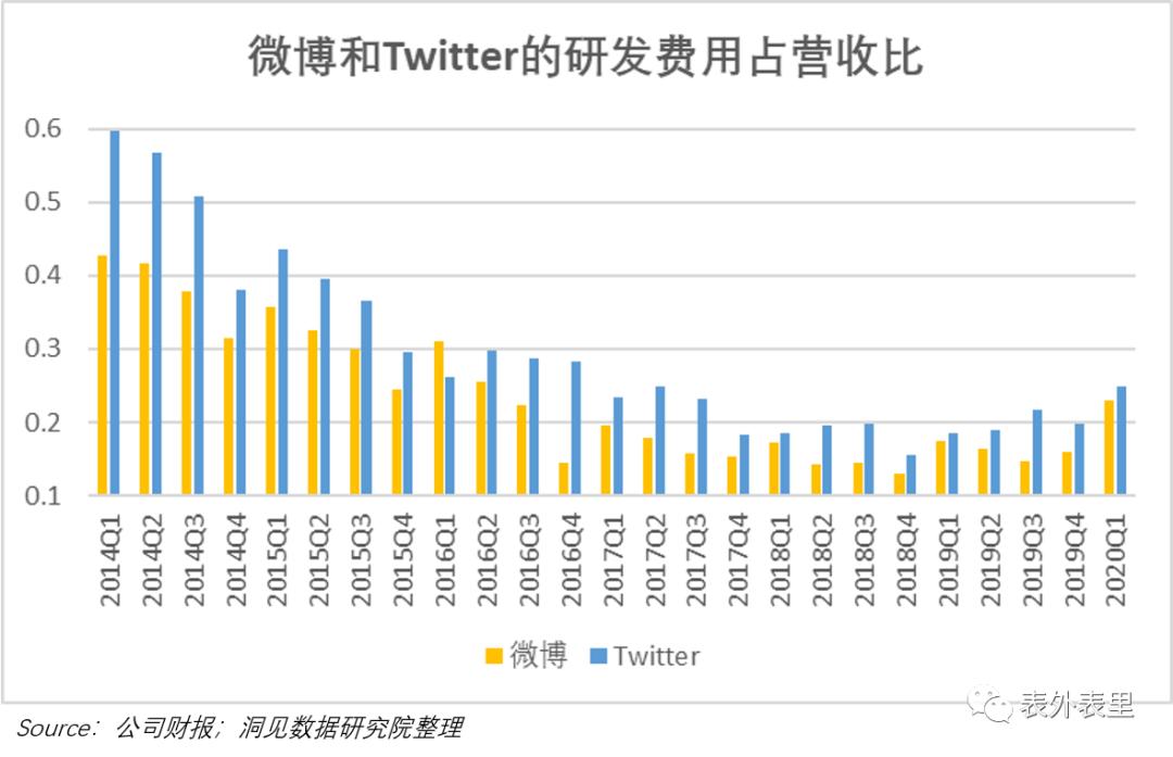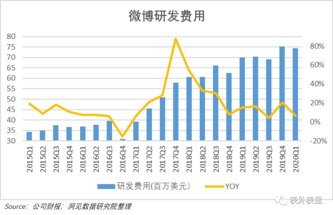 (*2020Q1微博研发费用占营收比的迅速提升,源于营收增速的大比例下滑,而不是研发费用的加码投入。)