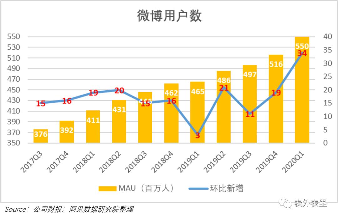 2020Q1,微博月活数达到5.5亿人次,国内用户体量的最大的公域社交媒体;环比上一季度增长了3400万人,俨然像一个高增长期的企业。