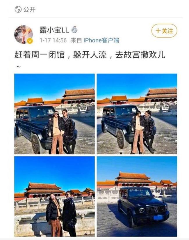 账号名为@露小宝LL的用户,在微博放出周一自己驱车前往故宫,驶进禁止车辆通行的金水河区域拍照留念的照片,并配文“躲开人流,去故宫撒欢儿”。