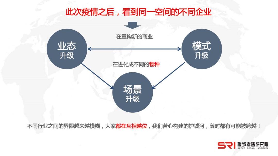 新业态会推动模式升级,模式升级和业态升级共同为场景带来新变化,进而会进化成不同的物种。在这种环境下,不同行业之间的界限越来越模糊,大家都在互相越位,我们苦心构建的护城河,随时有可能被跨越!
