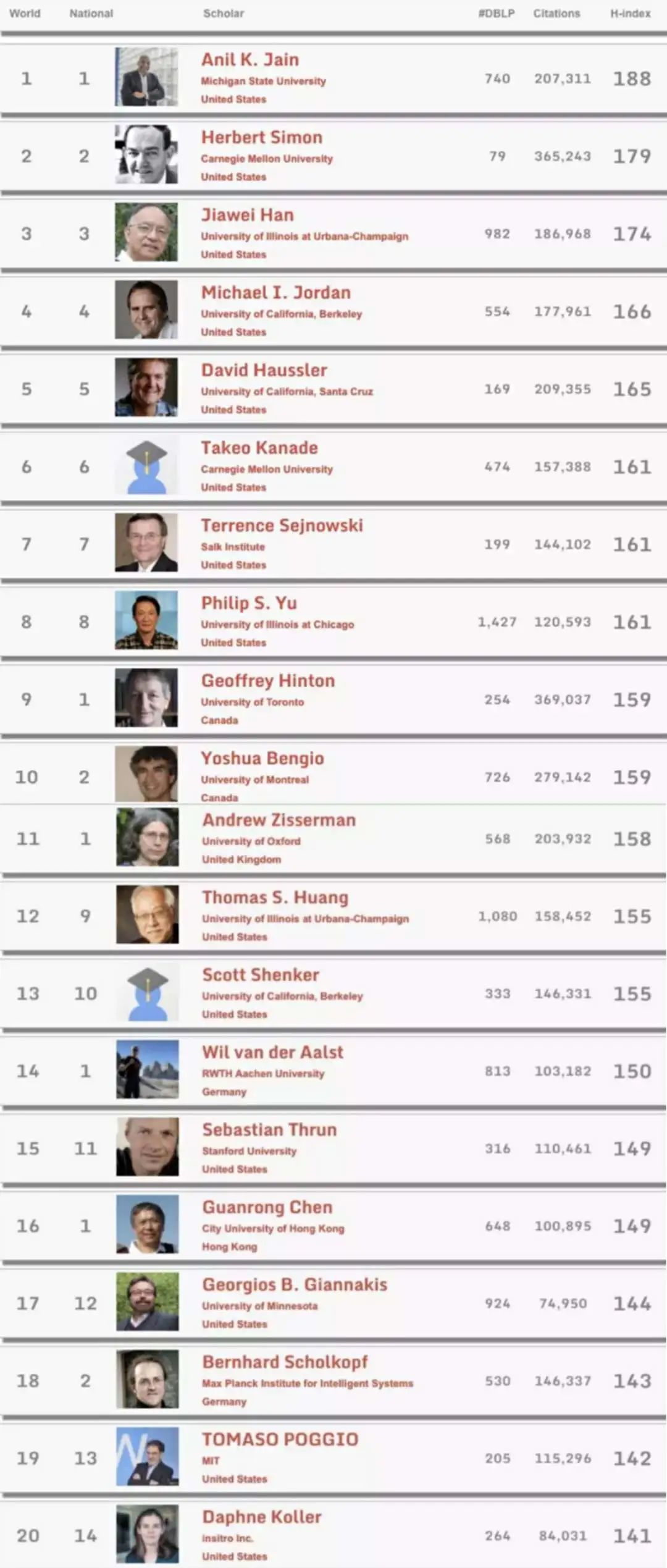 来看跟人工智能相关的学者:统计机器学习大牛 Michael I. Jordan 排名全球第 4,h-index 为 166。「深度学习教父」Geoffrey Hinton,排名第 9,h-index 是 159,18年排名第12。