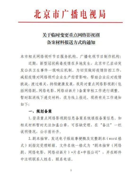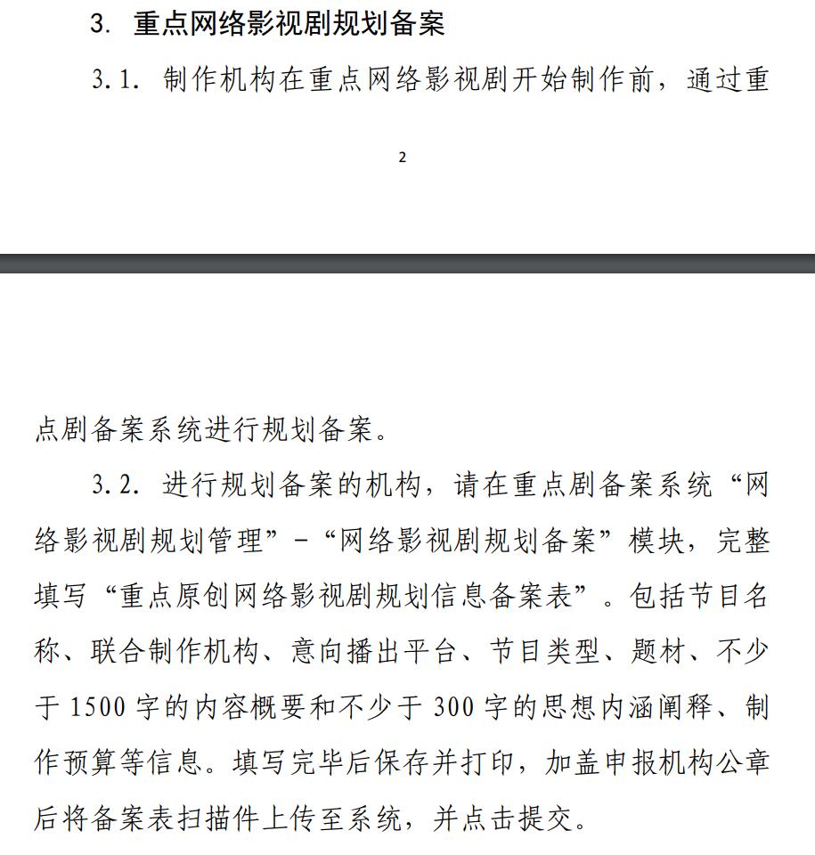 按照规定,自2月14日起,在“重点网络影视剧信息备案系统”中申报规划备案的项目必须提供公司落款盖章的完成剧本承诺书。如果内容涉及政治、军事、公安等敏感内容,申报备案前还需拿到有关主管部门的书面同意意见。
