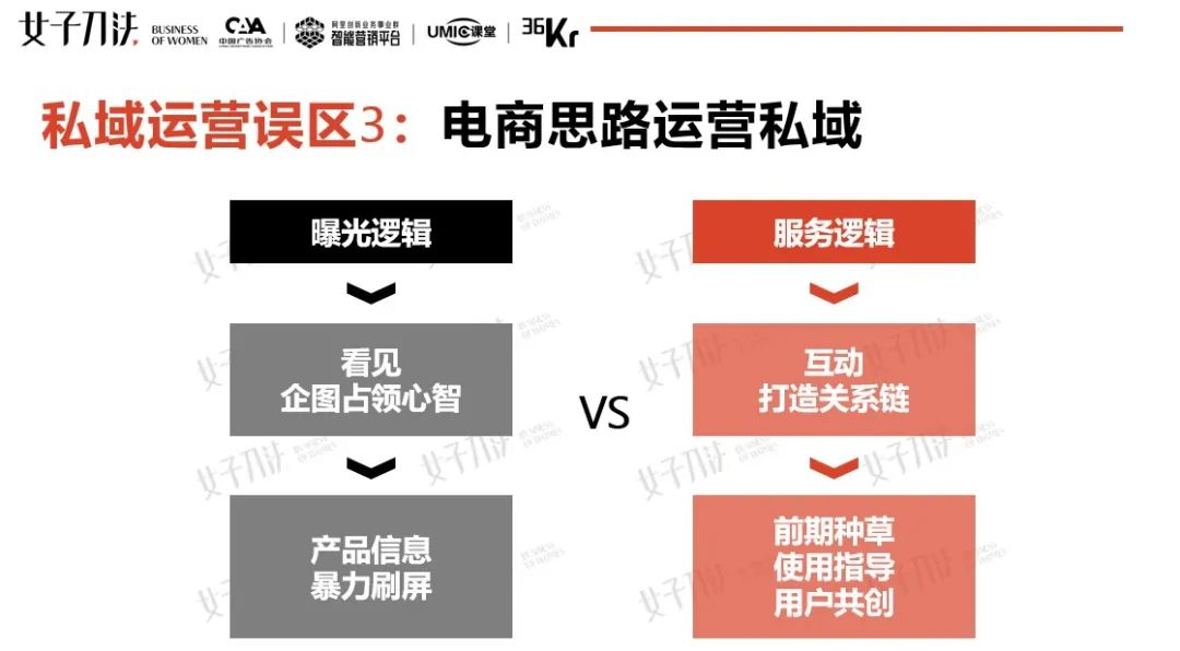 很多企业会让电商运营和客服转去运营私域,这种逻辑显然是错误的。私域不是卖场的流量逻辑,而是用户运营逻辑。是品牌具象化、人情化的场所。如果用电商运营的玩法去运营私域,那就本末倒置,完全曲解了私域的含义。
