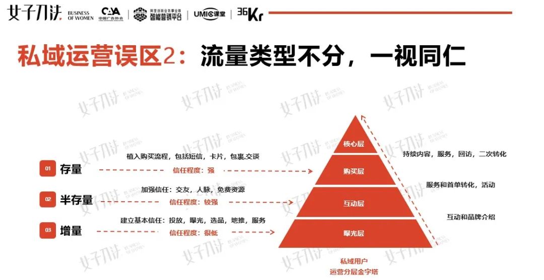 存量,指已经购买过产品的消费者。这群用户对品牌的信任度是最高的,也是做私域时,最应该积累的一群用户;半存量,指知道你但是没有下单的用户。这群用户对品牌的信任度也是比较高的,通过继续给予免费资源、人脉等方式,也可以把这类用户吸引到私域中来;增量,是指在投放过程中曝光的用户。这类群体对你的信任和认知是最低的,你需要花大量时间做品牌认知,建议主要在公域上沉淀。