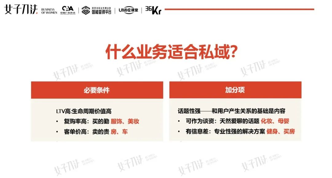 一是有天然谈资的品类。比如化妆品、护肤,再比如母婴,这些话题天然就有讨论欲望。其次是有信息差的品类,专业性非常强的,比如健身、营养师、买房、买车等,一般都是通过信息差来做私域。