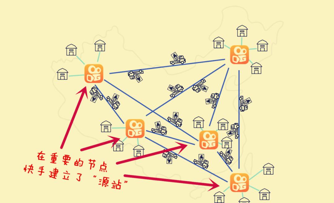 货物通过快手自己运输队,按照指定的时间在最近的分发点上做货物合并,然后再派发给观众。