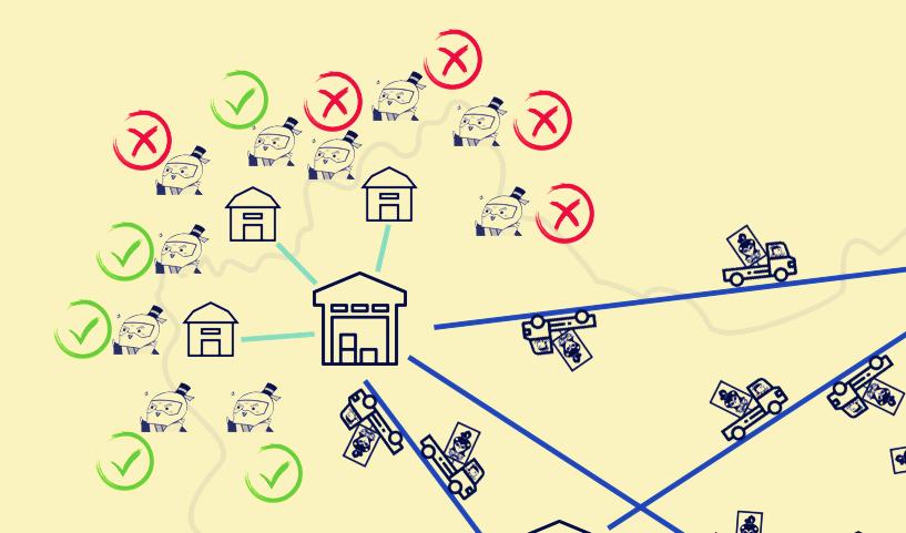 一开始团队确实是这样做的,但是“A/B 测试”下来,效果不升反降。。。原因是,对你来说最优的派送点,对于你的邻居来说也是最优的派送点。如果大家都选择这个点,这里就会“爆仓”,本来最快的点就变成最慢的,大家都拿不到快递。。。