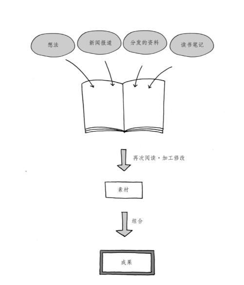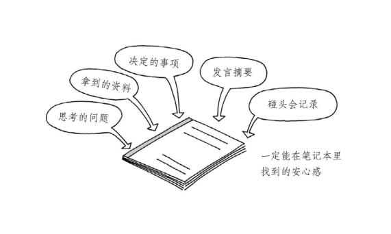 我们日常工作中的创意、读过的书的摘录和感想、报纸和杂志简报、他人的留言贴、信件和明信片、名片、打印好的文件、对电影的记录、私人日志……总之,就是一切需要记录的东西,什么都不要考虑,尽量在一个本子上记下来。