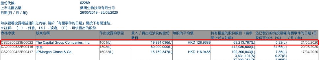 5月25日,联交所资料显示,美国资本集团(The Capital Group Companies)在5月21日增持药明生物1993.4万股,每股平均价128.9689港元,涉资25.71亿港元。增持之后,美国资本持有药明生物5.32%的股份。