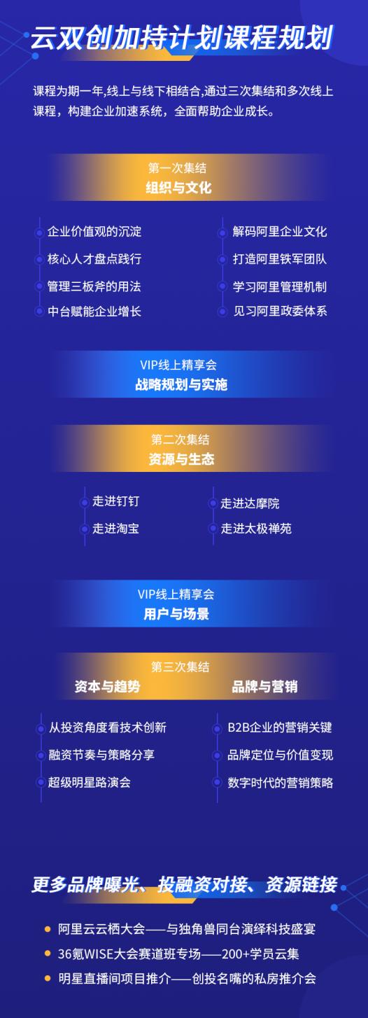 这是阿里联合36氪,聚合阿里生态业务、资本、行业资源,加速各赛道优质创新企业成长的赋能平台。截至目前,成功举办三期,共聚集100位企业创始人,与阿里60多条业务线产生1000+业务合作,近200家资本参与赛道明星班项目,达成56笔投资,学员企业总估值增长263%,已达到718亿。