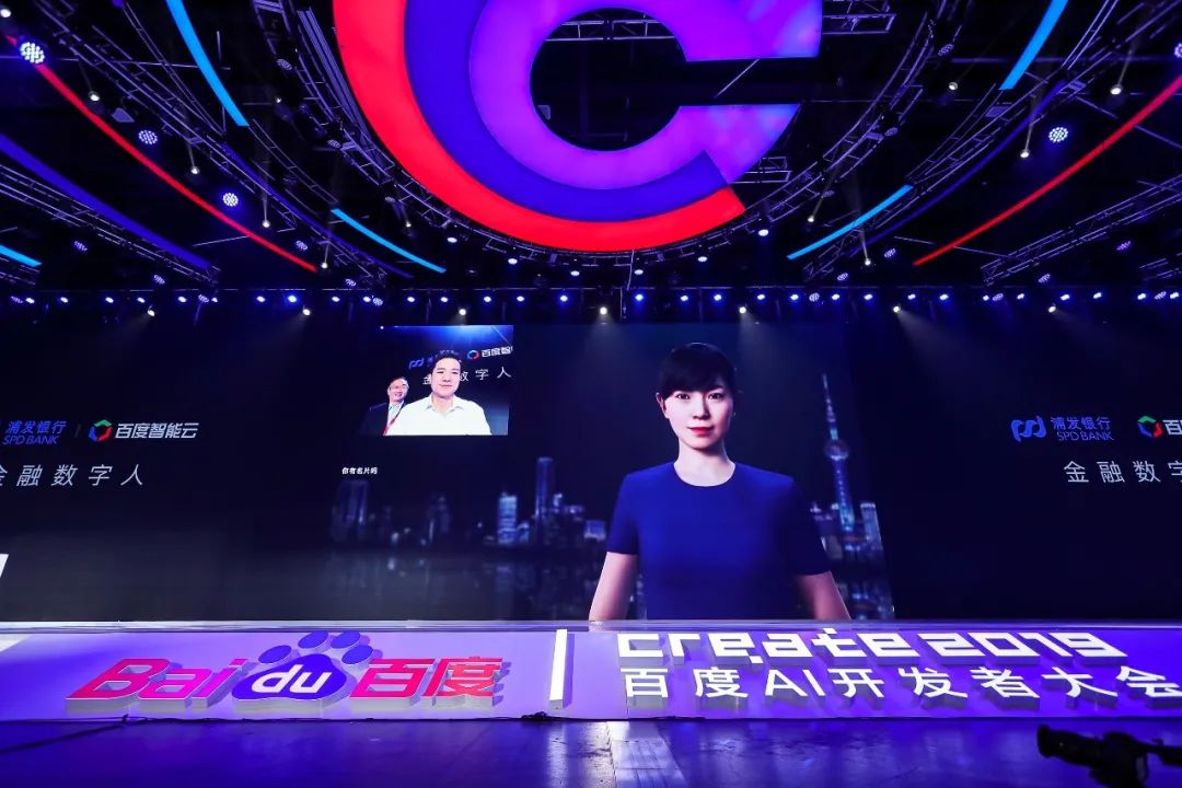 李彦宏在2019百度AI开发者大会上与数字人“小浦”互动