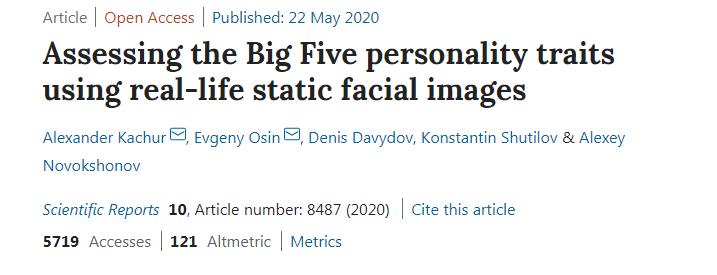 5月22日,Nature发表了一篇论文,由莫斯科大学(Moscow universities),HSE大学(高等经济学院,Higher School of Economics)和开放大学人文与经济学院(Open University for the Humanities and Economics)组成的研究团队征集了12000名志愿者,利用31000张自拍,学习了128种人脸特征,在与志愿者自己填写的信息相比之后,研究者们发现,AI识别的准确率达到了58%,并且,AI的表现比算命先生更稳定。