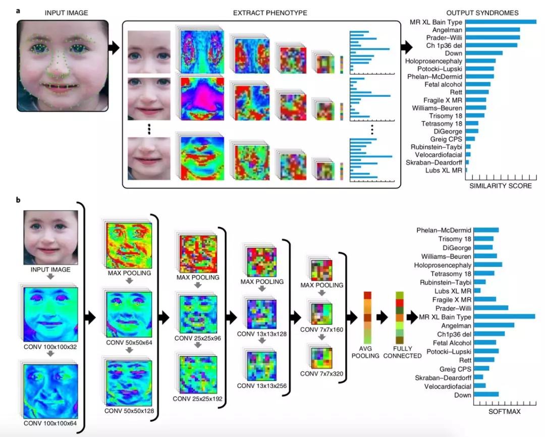 比如医疗,去年1月,Nature Medicine刊登了一篇论文,论文中提出了一种深度学习算法DeepGestalt,该算法能在儿童身上检测出罕见遗传病,而利用到的,正是面部照片。