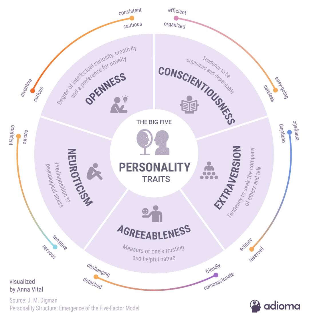 在对志愿者识别结果的分类上,研究人员参考了五大人格特征(Big Five),即责任心(conscientiousness)、神经质(neuroticism)、外向性(extraversion)、亲和性(agreeableness)、开放(openness)。