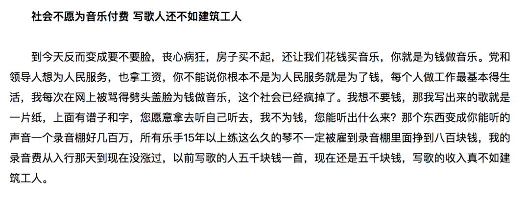 高晓松终归还是个理性主义者,也曾多次为音乐人发声,但每一次提到付费就会被"被骂得劈头盖脸为钱做音乐"。但是七年过去,如果大家的听歌观念还停留在"听歌竟然还要花钱"的阶段,那中国的音乐付费要做起来是真的难,中国的音乐人也是实惨,几百万设备做出来的歌,最后一分钱都收不回来。