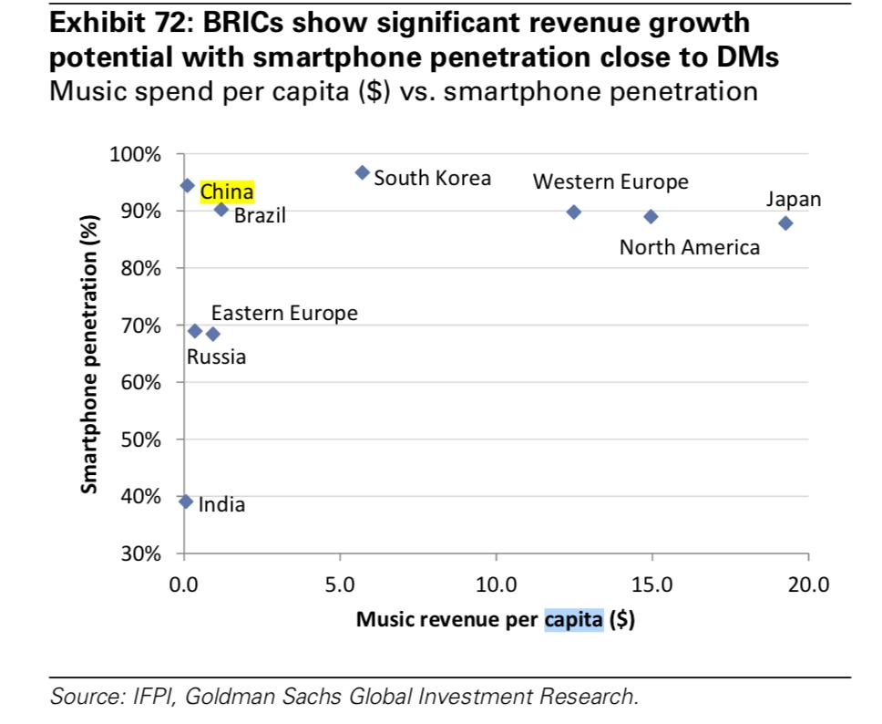 最后分享高盛发布的音乐行业报告《MUSIC IN THE AIR》里的一组数据。高盛预测,到2030年,中国将占据全球音乐流媒体用户的最大份额,在12.2亿付费用户中占20%,即2.44亿;而美国将排在第二位,占13%。