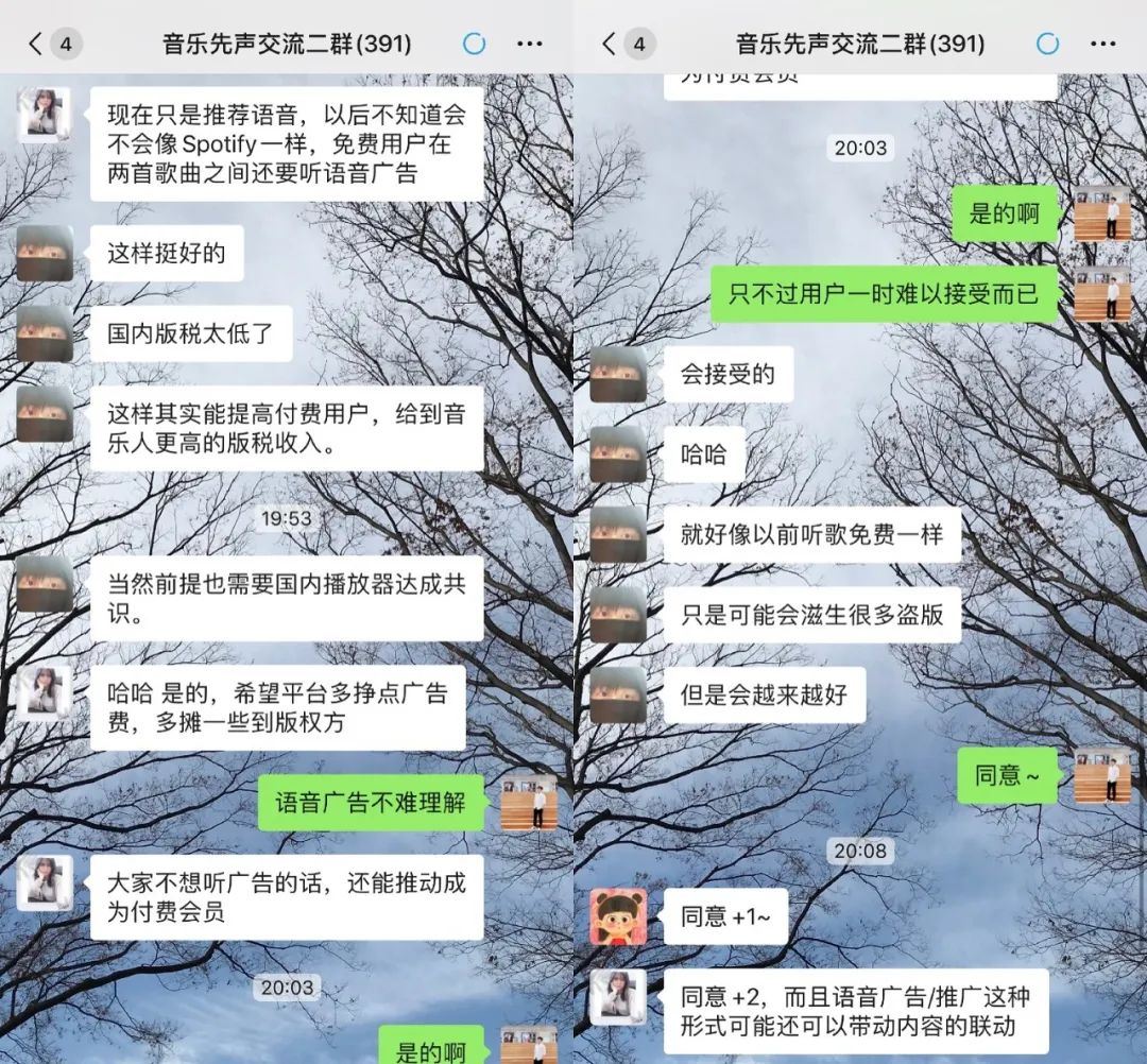 说回QQ音乐插播语音广告,业内反馈和大众抵触其实是不大一样的。以音乐先声读者群中从业者的讨论来看,大多对这一尝试表示了支持,认为"这样其实能提高付费用户,给到音乐人更高的版税收入"、"希望平台多挣点广告费,多摊一些到版权方"、" 语音广告/推广这种形式可能还可以带动内容的联动"。