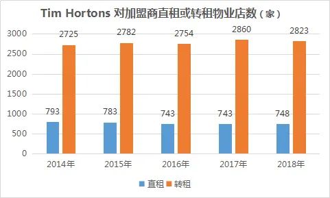 2014-2018年,Tims咖啡门店中,由品牌方向加盟商直租或转租物业的门店占比,一直高居70%以上。