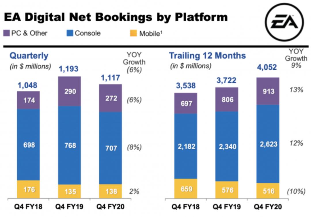 结合EA目前的收入结构可以看到,数字游戏的销售已经成为公司最为重要的收入来源,EA2020财年数据显示,整个财年55.4亿美元的收入中,数字净预定额达40.52亿美元,同比增长9%,占净预定额总数的78%。分平台来看,主机和PC端的净预定量同比增长12%、13%,移动端净预定量同比下降10%。