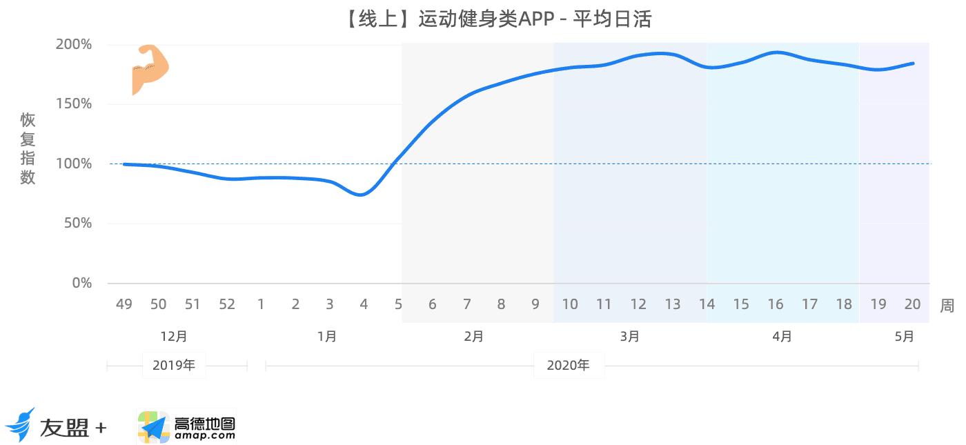 除了在出行方面表现出的谨慎小心,人们对身体强健和心理健康都有更明显的关注和追求。就像是做了一场瑜伽,在放缓甚至停摆的世界里,注意力终于聚焦在自己的呼吸上。2月全民宅家以来,运动健身类App使用热度持续攀升,天气转暖进一步巩固了利好态势。