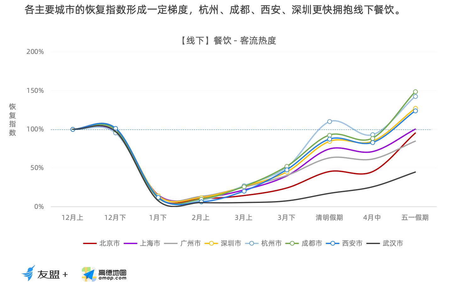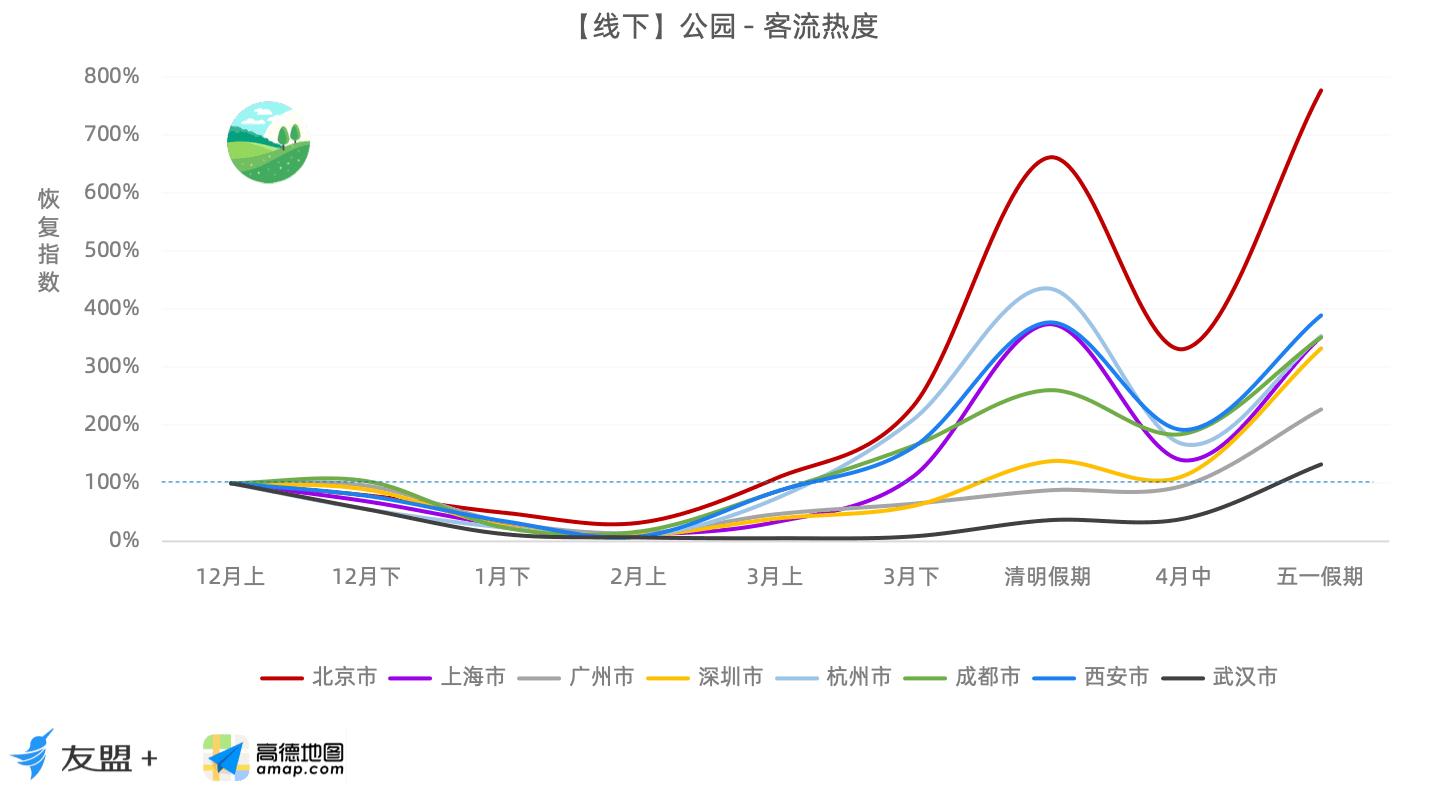 作为疫情防控级别持续较高的两个城市,武汉和北京的线下场景恢复要相对滞后于其他城市。以杭州作为参照,在进入五月之前,北京的恢复程度约在杭州的五六成,武汉仅为二三成。