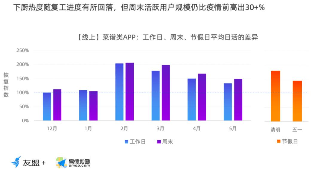 宅在家中被迫下厨,厨房成了人们的新乐园,即使现已复工,菜谱类App仍有较高留存,开火做饭成为了认真生活的表现之一。“你饿不饿,我煮碗面给你吃”取代了一部分“突然好想吃鸡翅,不如我们点个外卖吧”的饮食习惯。
