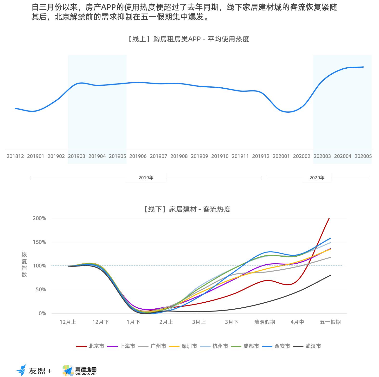 对于房产市场的金三银四,2020年的旺季虽然来得晚了一些,但势头强劲。房产类App的使用热度在今年4月、5月相比去年同期都有近30%的涨幅。