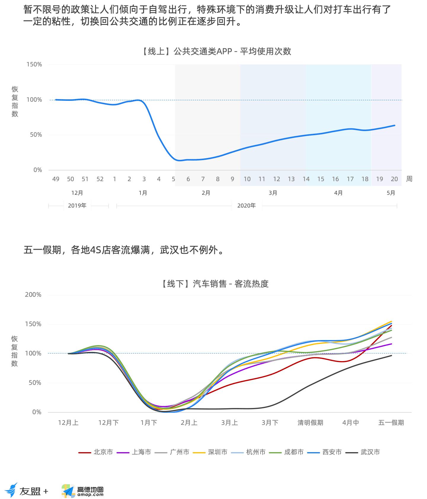 各地复工进度都达到了较高的水平,人们对公共交通的信心仍然在回升中,打车/叫车出行的消费升级体现出了一定“棘轮效应”。与此同时,走高的线上汽车资讯关注度和线下汽车销售客流热度共同预示了人们较强的购车意愿,前期被压制、被延迟满足的需求开始消化。五一假期,各地4S店客流爆满,武汉也不例外。