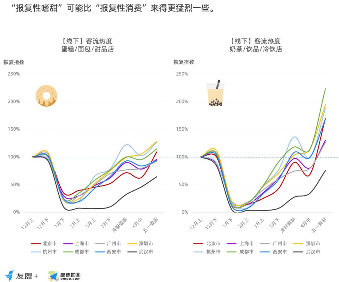 线下餐饮逐渐恢复,各主要城市的恢复指数形成一定梯度,新一线城市的外食热情略高于北上广,杭州、成都、西安、深圳更快拥抱线下餐饮。特别地,奶茶店的客流热度表现出了一路飙升的势头,“报复性嗜甜”可能比广泛期待的“报复性消费”要来得简单直白。