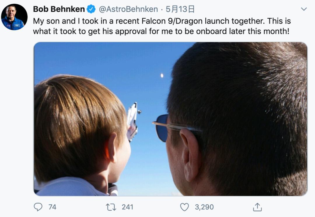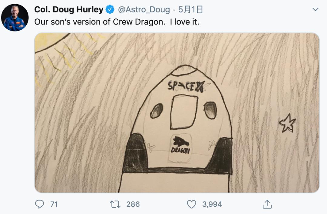 有意思的是,同在 2000 年被选为宇航员的退役海军陆战队队员 Doug Hurley,曾在 2011 年亚特兰蒂斯号航天飞机的最后一次飞行中飞行,见证了美国航天飞行的退役,而这次他又将亲自开启商业载人航天时代。如今两人都已为人父,5 月 12 号,Behnken 在推特发文称,他必须在发射前得到年幼儿子的批准,而 Behnken 在四月底也分享了他儿子画的 “Crew Dragon” 号。